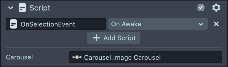 Add the script to your scene and use the inspector panel to set the "carousel" input field to reference the carousel component in the scene.