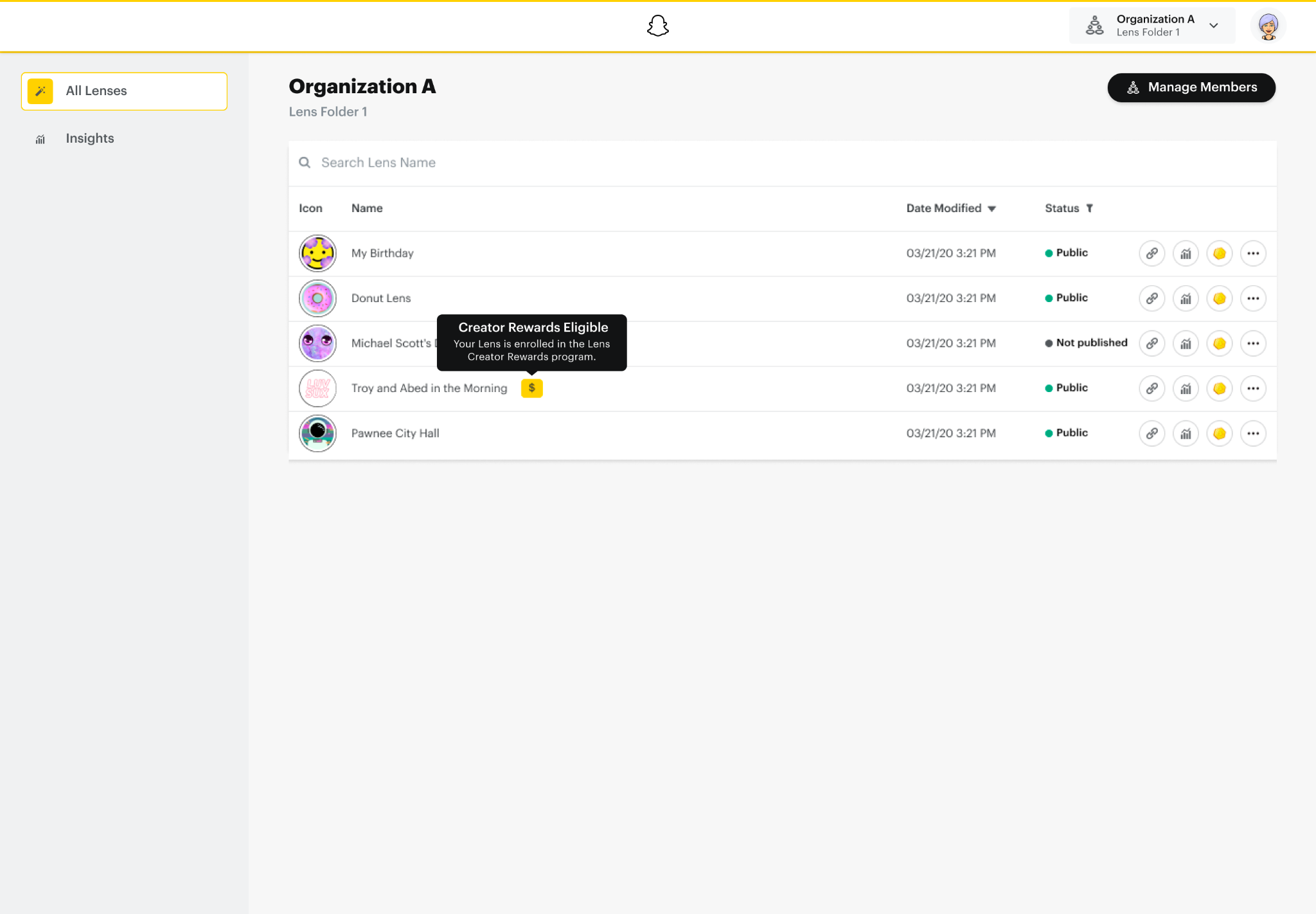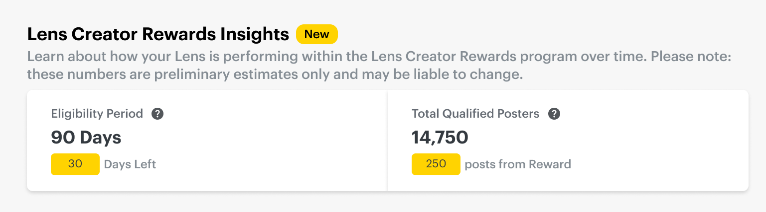 A: For each Lens, you can navigate to the Lens Details page within My Lenses. There, you will see a section titled “Lens Creator Rewards Insights” which provides you with information about how your Lens is performing in the Program. Note: you will not see this new Insights section while your lens is in the Pending state or is marked as Ineligible for the program.