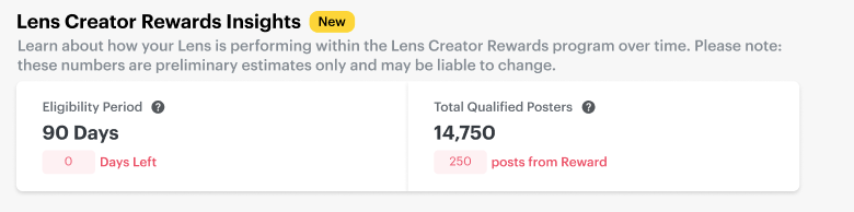 - In order to be eligible for a reward, a newly submitted Lens must accumulate at least 15,000 Qualified Posters and meet all eligibility criteria in order to qualify for a reward.