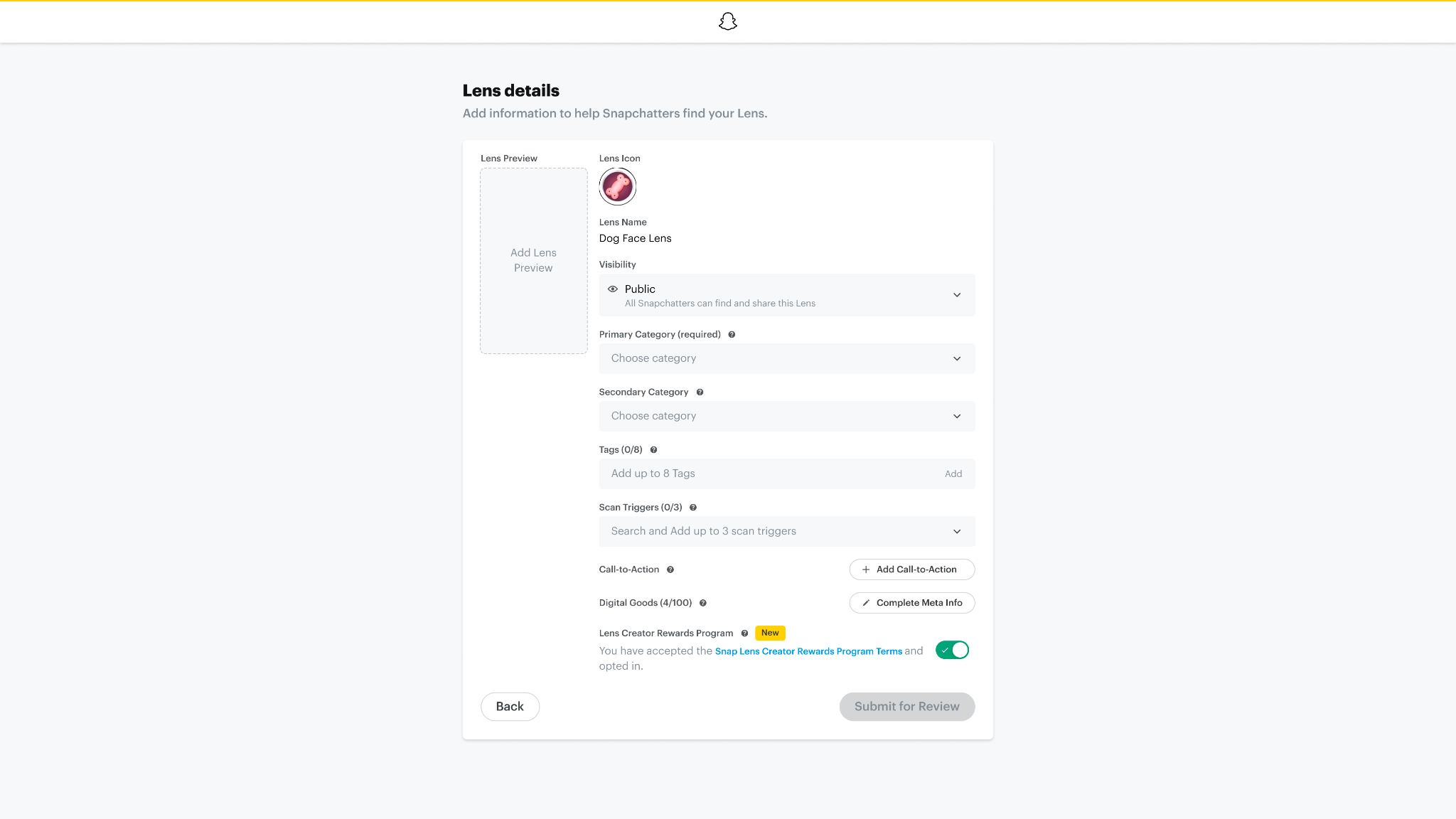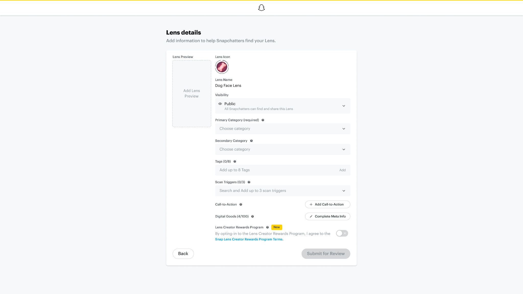 After you click Submit Lens, you will be brought to the Lens Detail page view. If you are part of an eligible Country/Region, you will automatically see a new opt-in toggle for the Lens Creator Rewards Program. If you are not, you will not see the toggle: