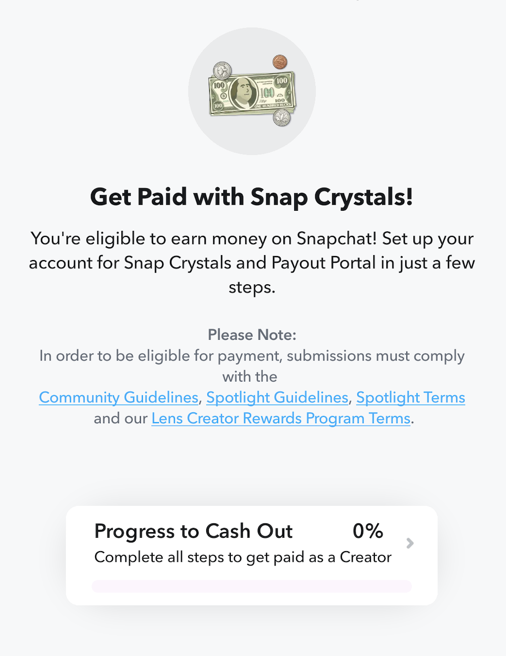 If this is your first time receiving a Lens Creator Reward, you will need to set up your profile by clicking Progress to Cash Out