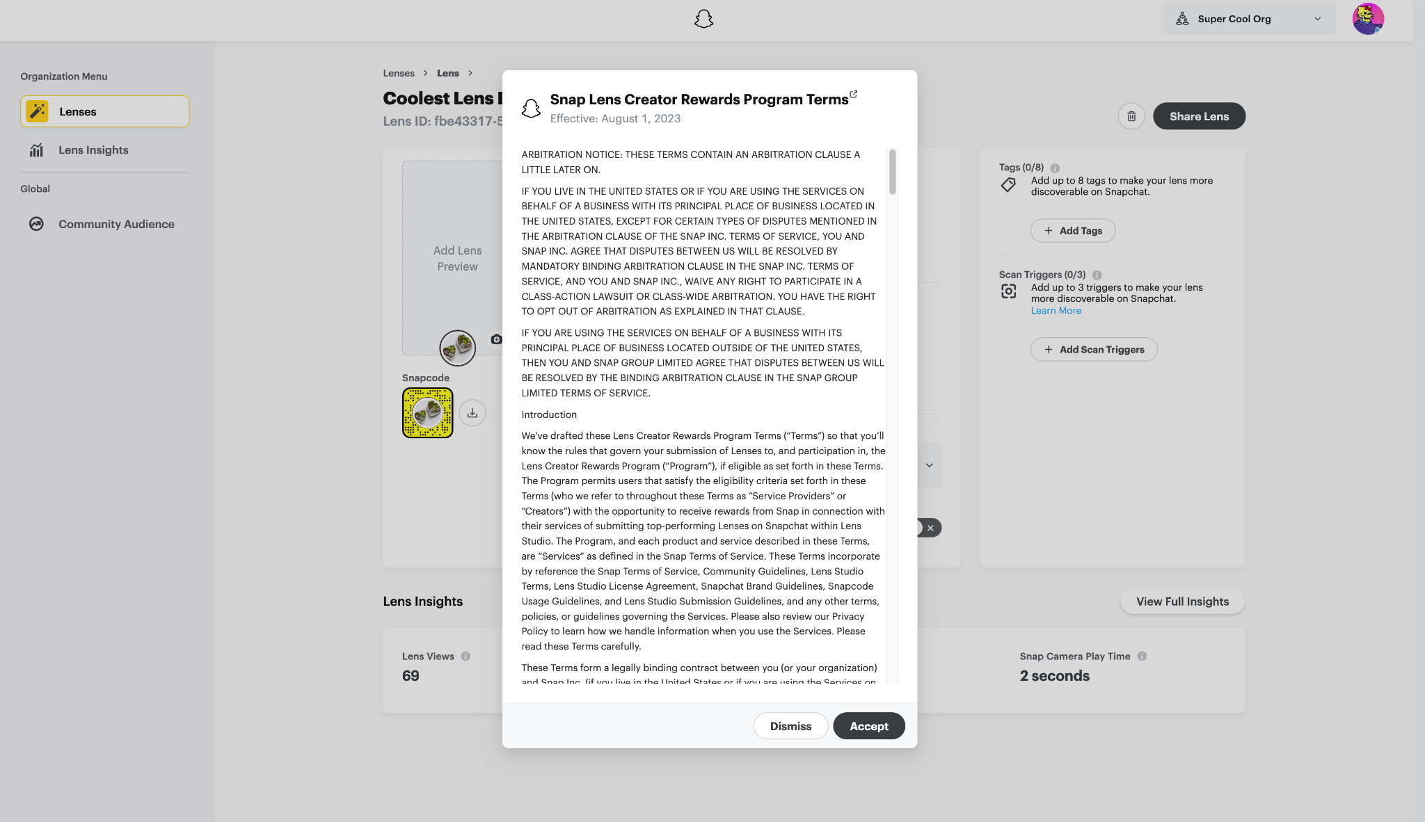 Opt in and accept the Snap Lens Creator Rewards Program Terms.