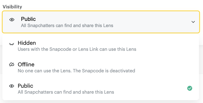 In order for your lens to be considered for the Lens Creator Rewards Program, the visibility status within the Lens Details page must be set to Public. Lenses marked as Hidden or Offline will be excluded from the program.
