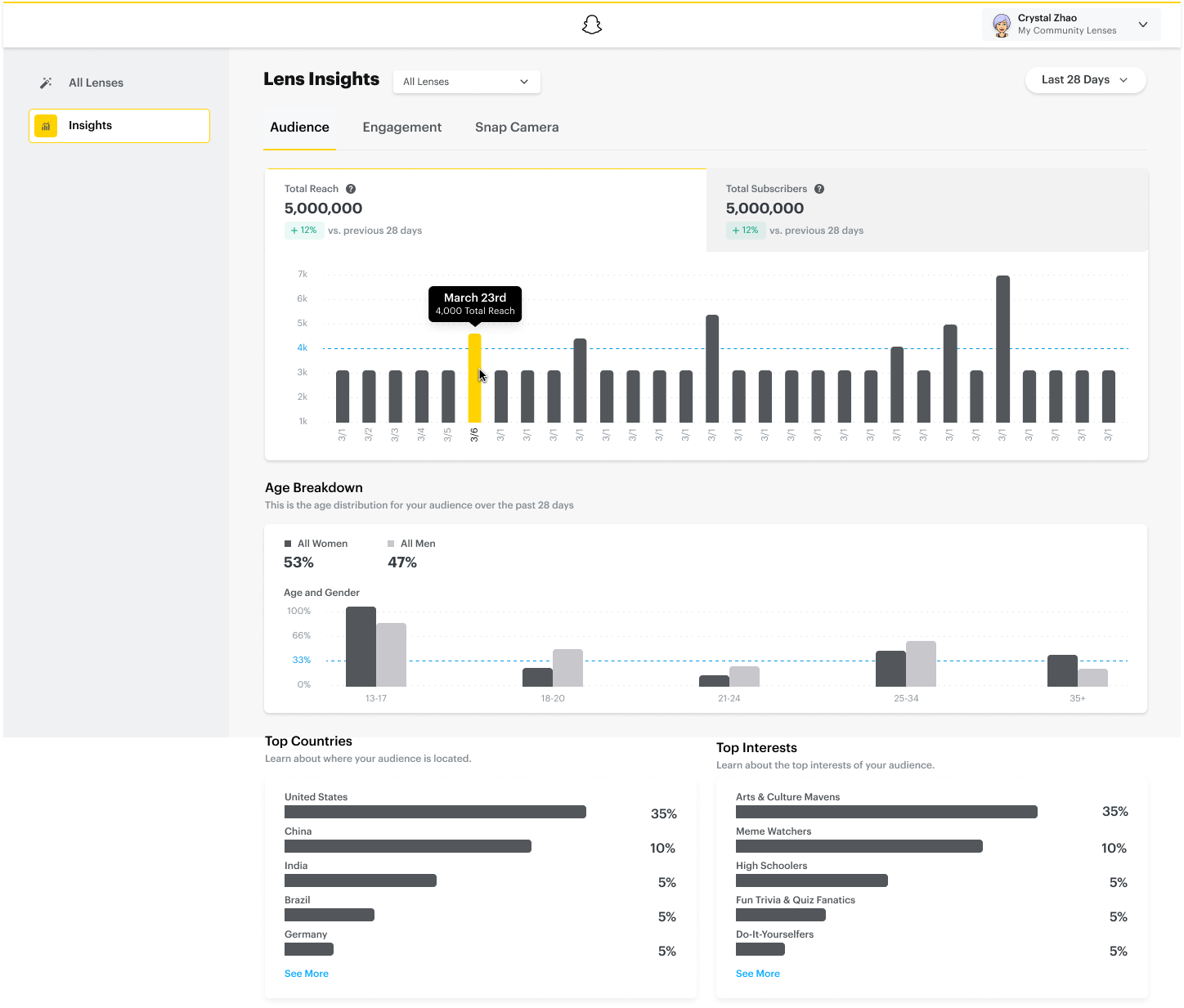 Lens Insights help you learn more about your audience and how your Lenses are used in Snapchat so you can create more relevant content and iterate on your Lenses to reach your goals.