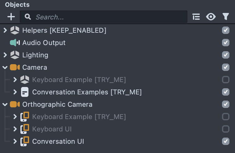 In this example, you can modify lines for the two robot characters. Based on the context, the characters will speak with different voice styles. Disable Keyboard example and keyboard UI and enable Orthographic Camera -> Conversationt UI and Camera -> Conversation Examples objects. Reset the preview and click Tap to play button to play the conversation.