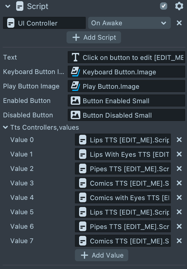 Click on Orthographic Camera, select UI and then select UI Controller to find the UI Controller Script Component. All the Phoneme Controllers are attached to the UI Controller Script Component. If the Tap to play button was tapped and the phoneme controllers are enabled, the editable text will be passed to the speak function in the phoneme controllers.
