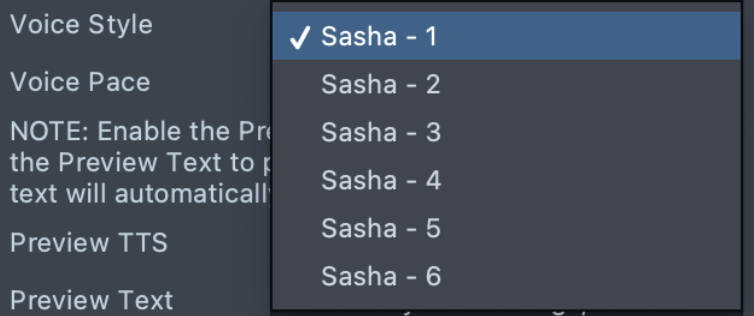 TTS supports six voice styles for Sasha and Sam.