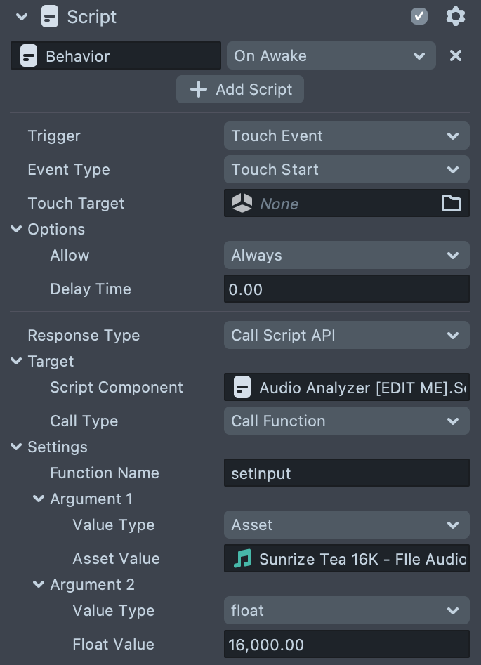 Or using Behavior script : Call Script API response by setting setInput as a Function Name, and passing input asset/component and Sample Rate as arguments: