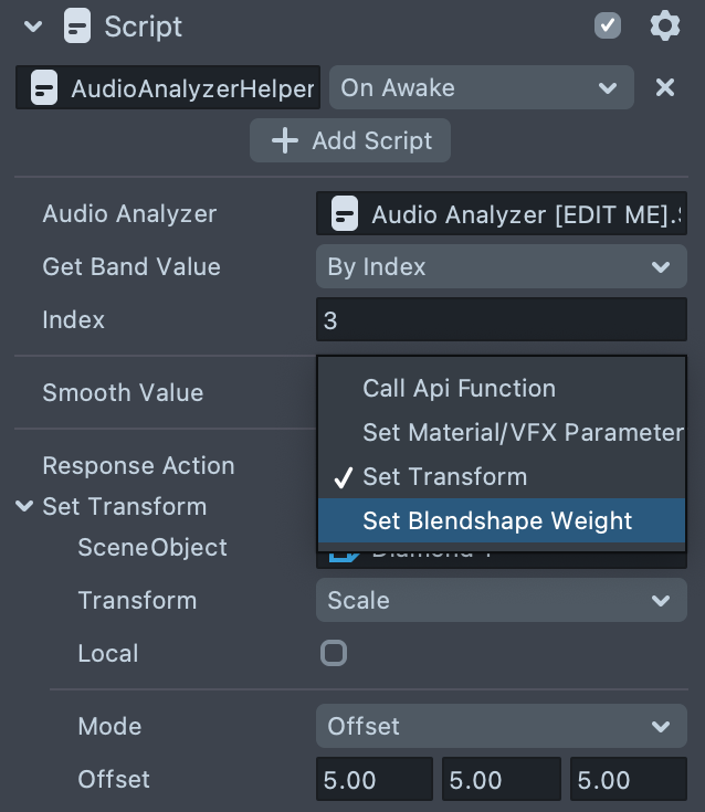 - All Bands: get all band values. Can be used to set the array property of the Material or VFX asset or passed as parameter to the script component api function.