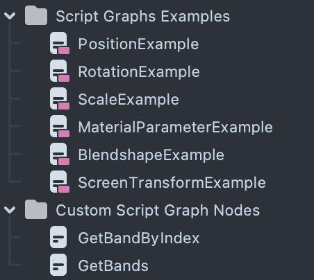 Example: Expand the 3D Object Examples scene object’s hierarchy. Each child object has a Script Graph Attached that controls one of this object's properties : position, rotation, scale