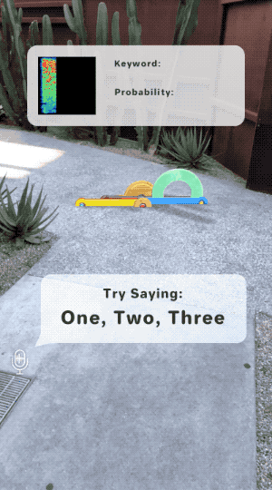 This template allows to detect certain keywords in the audio input and trigger effects when they are detected. The template generates melspectrogram image and predicts the probability of keywords with Machine Learning model.