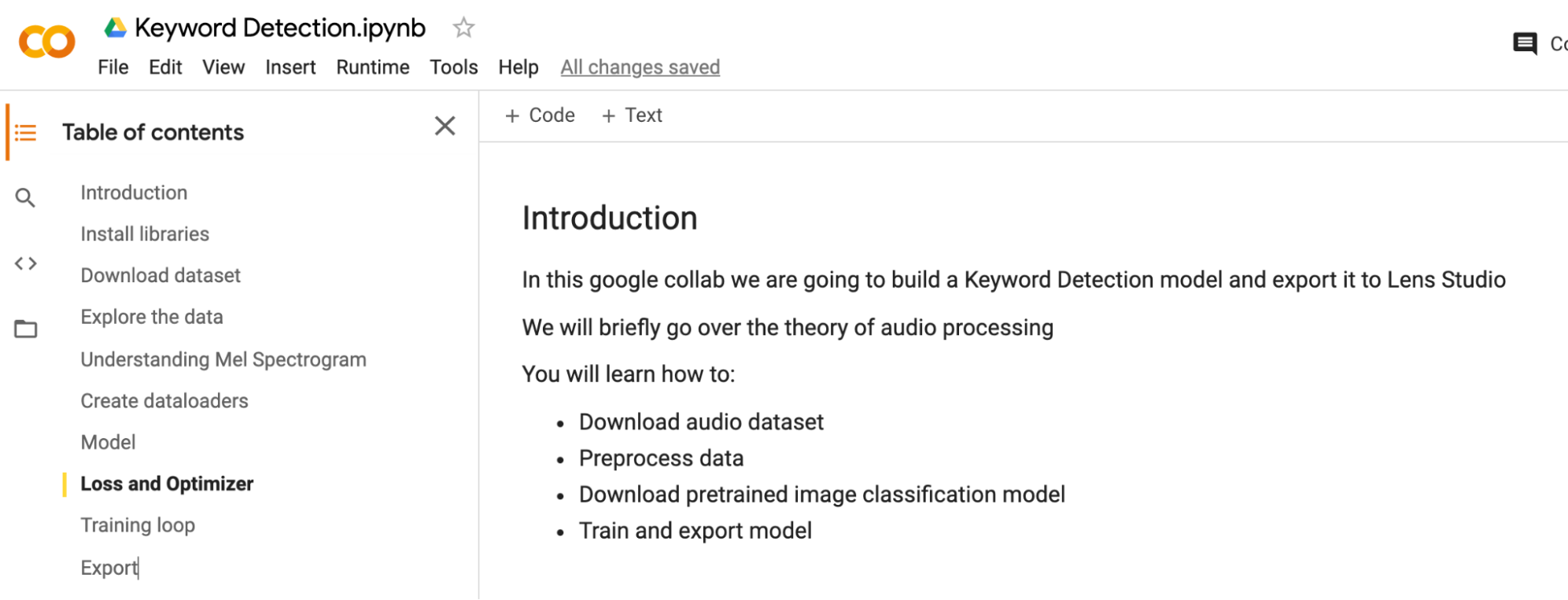There are many different ways you can train your model. For our example, we will use Google Colaboratory. To see other ways of training, take a look at the ML Frameworks page of the guide section.
