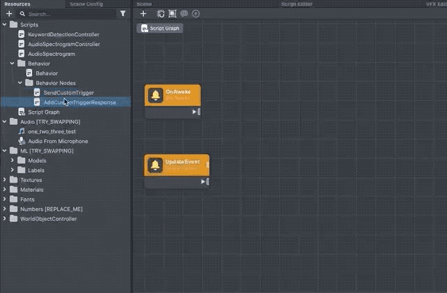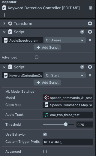 The keyword detection is driven by the Keyword Detection Controller object. This object contains the AudioSpectogram script which provides a function to calculate the MelSpectogram of an audio and generates spectrogram texture.(You can find more information about this terms in the training notebook) The KeywordDetectionController script then takes the generated texture, and passes it into an ML model.