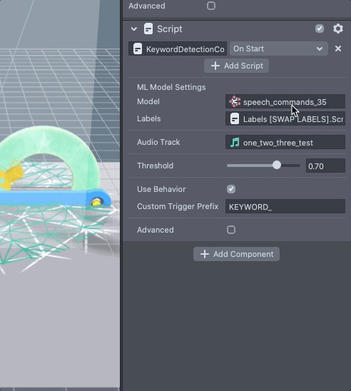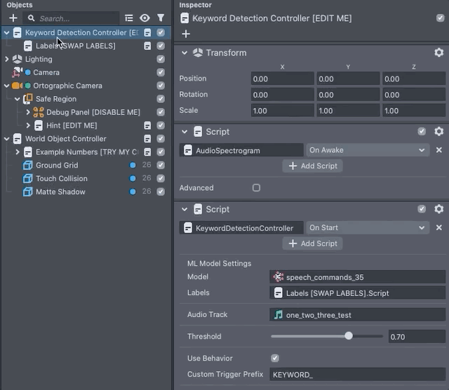 With the detection set up, we can next choose the Audio Track we want to analyze. By default the template comes with an audio of a person saying “one two three”. You can select the Audio Track field in the KeywordDetectionController script to change what the Lens is listening to.