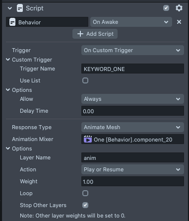 At the bottom of the KeywordDetectionController, you’ll find a checkbox to Use Behavior. This checkbox will tell the KeywordDetectionController to call a Custom Behavior Triggers when a keyword is detected.