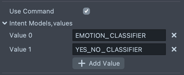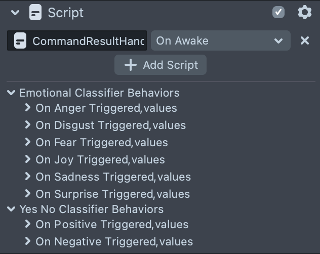 Now goes back to the Speech Recognition Script Component. Here we can see Use Command is enabled for Emotion Classifier and Yes_No Classifier.