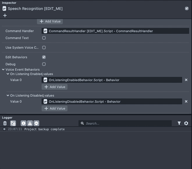 For each Voice Event Callback, we can assign multiple Behavior Scripts. Try to click on the Add Value field to attach new Behavior Scripts.