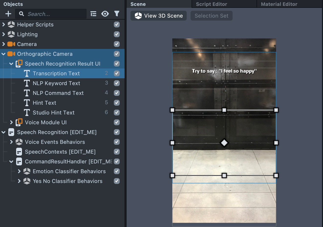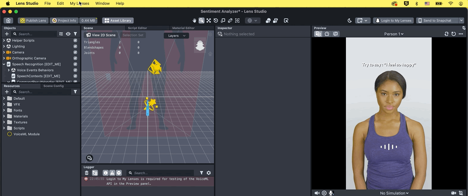 The Sentiment Analyzer template demonstrates how you can utilize the Emotion and Yes/No classifiers to enrich any vocally driven lenses with Speech Recognition. The template contains several helper scripts that you can use to trigger visual effects without the use of scripting.