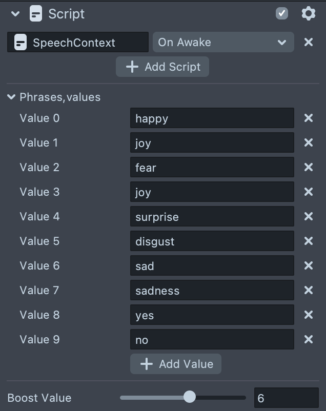 With Speech Context Script Component, we can add words to the phrases and set a boost value for the phrases. To add a new word, click on the Add Value field and input a new word you want to add.