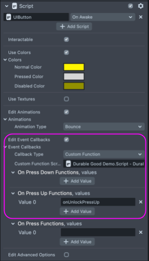 The Unlock button callback is configured in the Unlock Durable Button Inspector panel. The onUnlockPressUp function is added to the On Press Up callback.