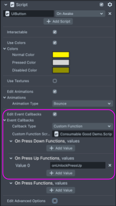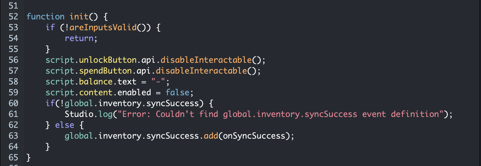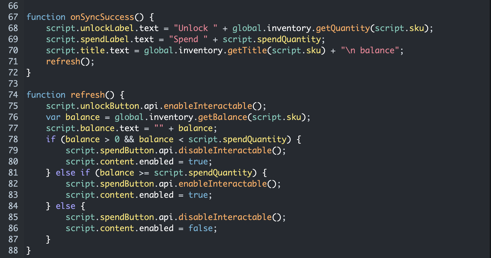 On awake, the script initializes by disabling interaction with the Unlock and Spend buttons. It also adds an onSyncSuccess callback function to the Inventory Manager’s global syncSuccess event.