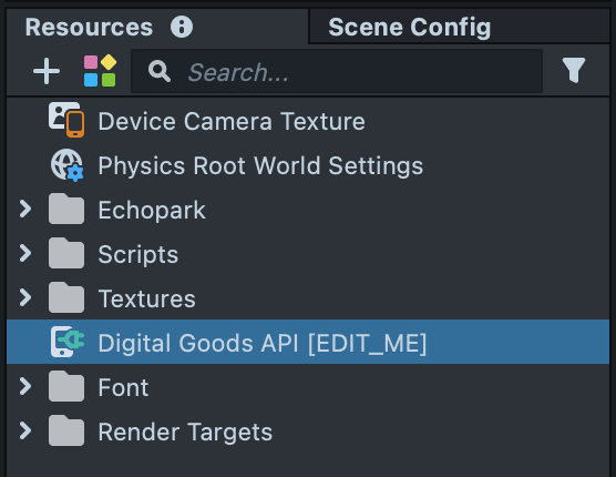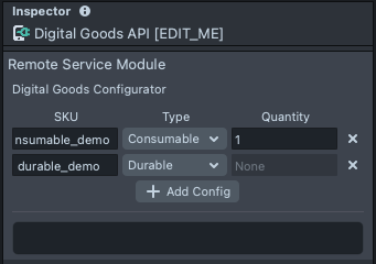 The example durable and consumable goods are registered in the Digital Goods Configurator. The Digital Goods Configurator can be accessed in the Inspector panel by clicking on Digital Goods API [EDIT_ME] in the Resources panel.