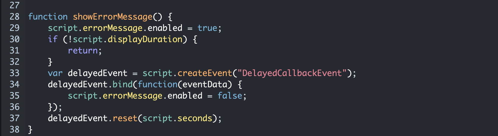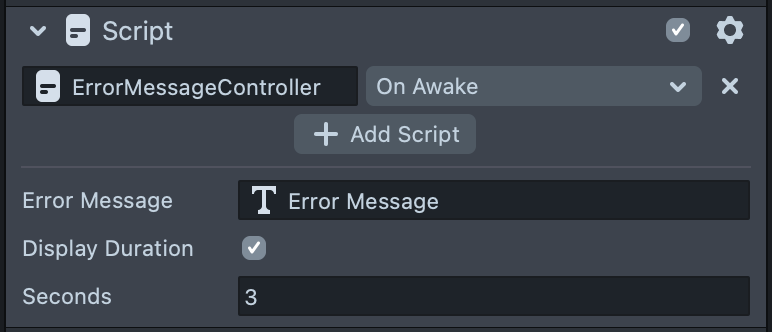 The Error Message is controlled by the ErrorMessageController.js script. The script takes the error message scene object as input and has the option to set a display duration.