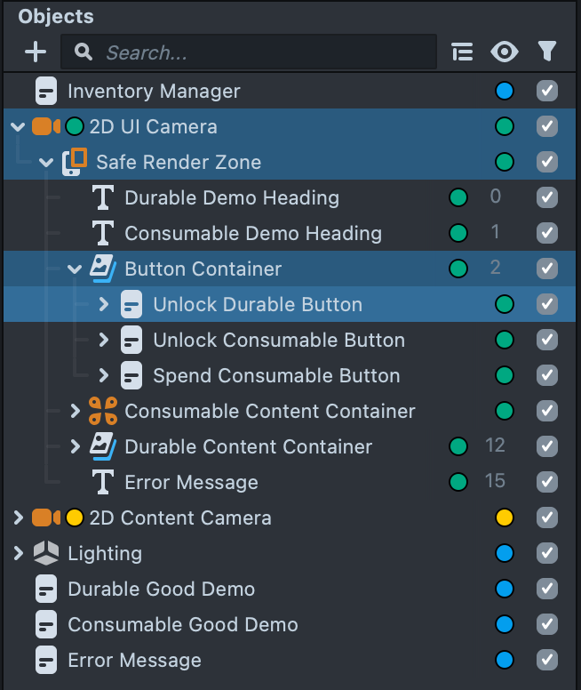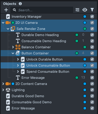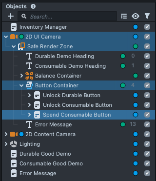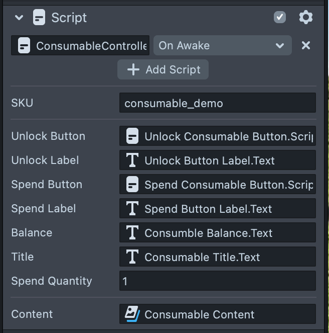 The Consumable Good Demo is controlled by the ConsumableController.js script. The script takes the item’s SKU, UI elements, and spend quantity as inputs. Spend quantity is the amount deducted from the item’s balance each time the consumable good is used. In most cases, spend quantity should be 1.
