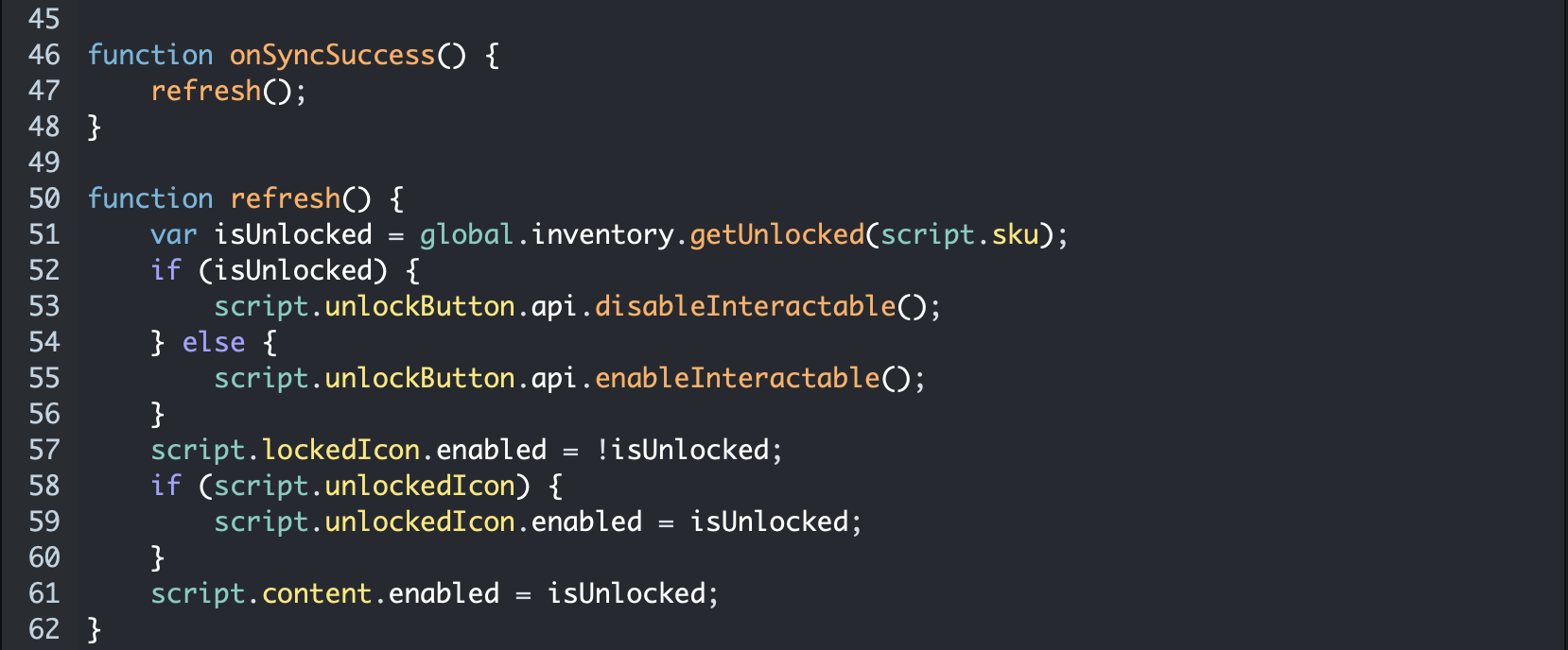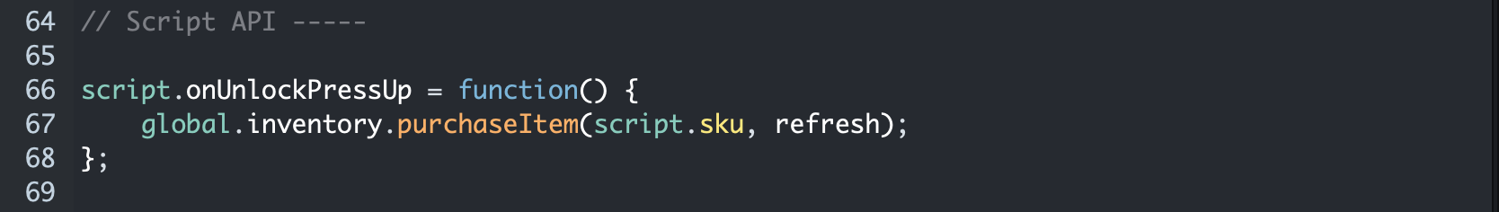The script also defines a script API that is called when the Unlock button is pressed to unlock the item. The refresh() function is passed to global.inventory.purchaseItem() as the success callback, which gets called when the user successfully unlocks the item and dismisses the Snapchat purchase tray.