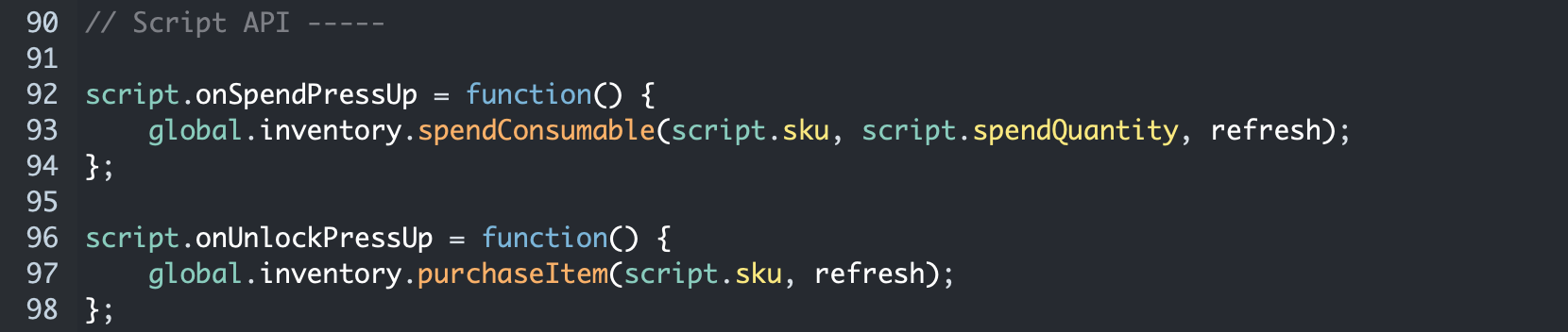 The script also defines script APIs that are called when the Unlock and Spend buttons are pressed to purchase and spend digital goods. On purchase and spend success, the consumable good UI is refreshed.