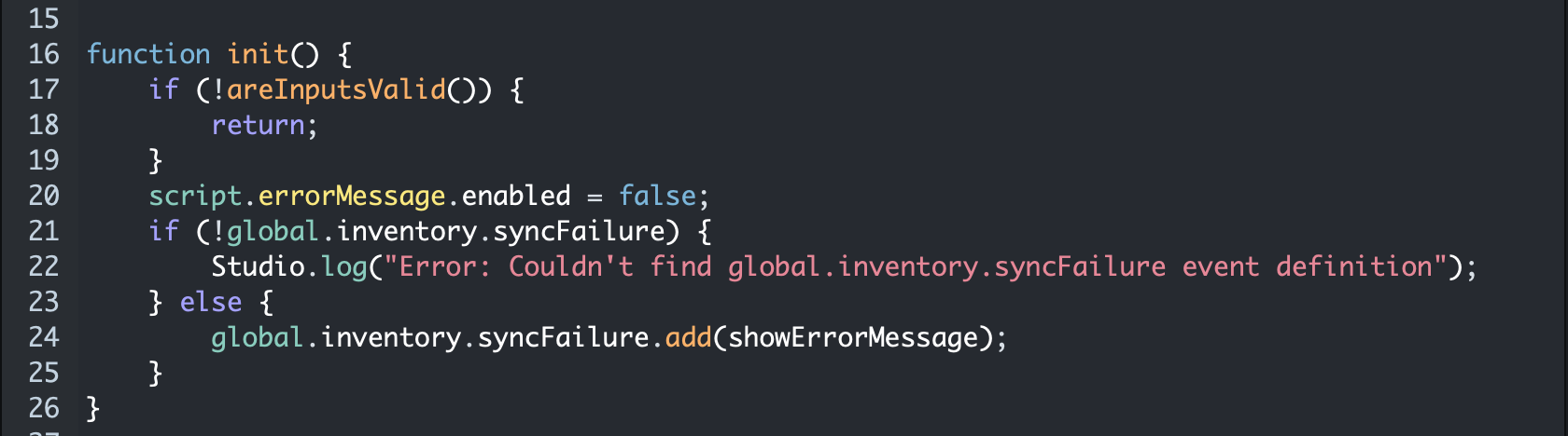 On awake, the script initializes by disabling the error message and adding an showErrorMessage callback function to the Inventory Manager’s global syncFailure event.