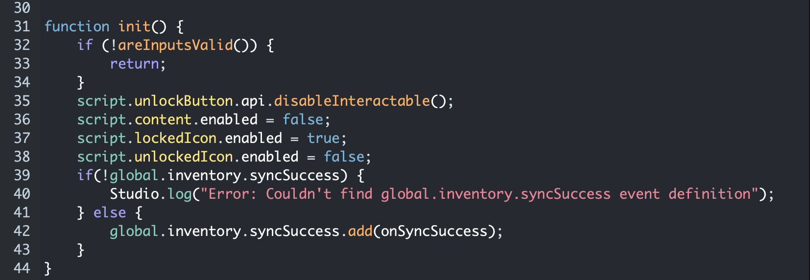 On awake, the script initializes by disabling interaction with the Unlock button and adding an onSyncSuccess callback function to the Inventory Manager’s global syncSuccess event.