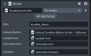 The Durable Good Demo is controlled by the DurableController.js script. The script takes the durable good’s SKU, UI elements (Unlock Button, Locked Icon, and Unlocked Icon), and a content placeholder (the pink square) as inputs.