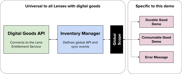 Together, these scripts handle the digital goods logic common to all Lenses. They are responsible for making API calls, handling responses, and syncing inventory on Lens start. InventoryManager.js provides global functions and sync events that are used by project-specific scripts to update the UI based on inventory information.