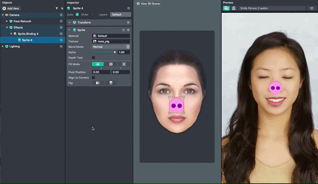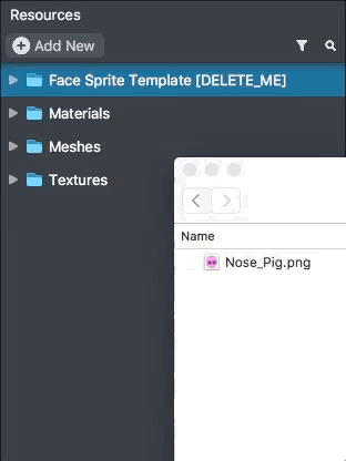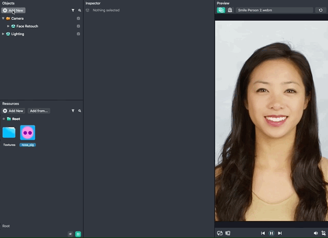 To add your texture to the scene, in the Objects panel, select + -> Face Effects -> Face Image. In the Inspector panel, click the Texture field and select your newly imported texture. You can also directly drag your texture from the Resources panel to the Texture field.