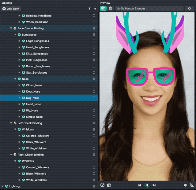 The 2D Objects Template provides a base for creating Face Lenses that attach 2D art to your head. The template contains example assets that can be toggled to try out different looks. This guide covers how to try out the various example art, and how to add your own artwork as an Image, as well.