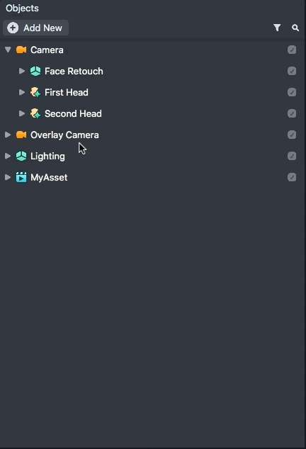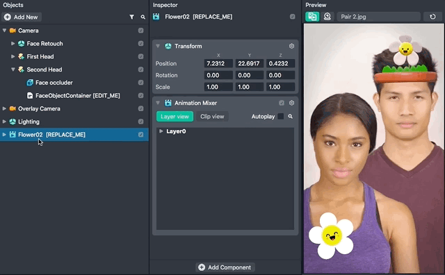 To add 3D objects to the second face, repeat the same process as above, but place it under the FaceObjectContainer below the Second Head. The Lens will automatically show and hide the object as needed depending on the number of heads visible.