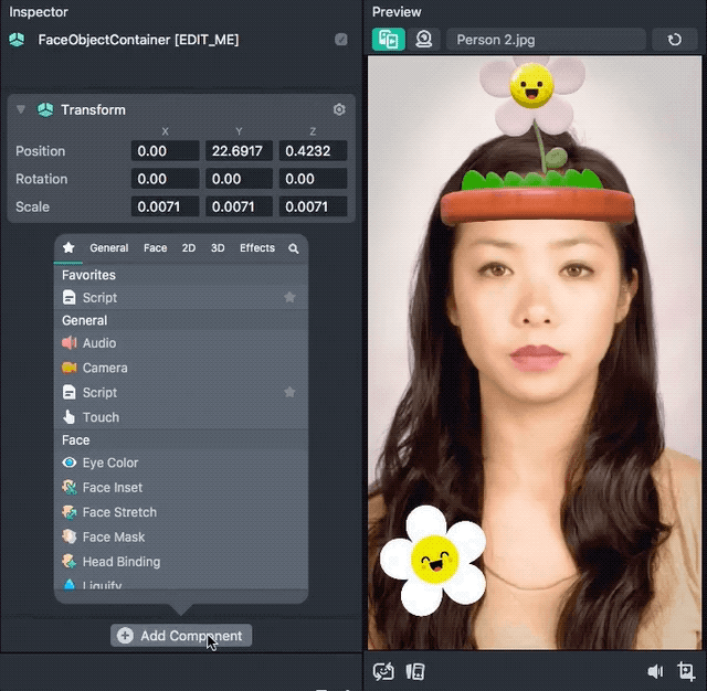 In the Scene panel, you can position, scale, rotate the world object relative to the head. In the Lens, the face object will automatically be locked to the face as shown in the Preview Panel.