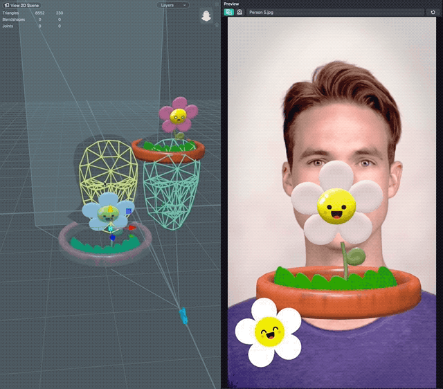 The 3D Objects Template shows you how to attach 3D objects to a face or multiple faces. For multiple faces, the 3D objects for each face can be the same or different. This template also includes a helper script to play looping animation on the 3D objects.