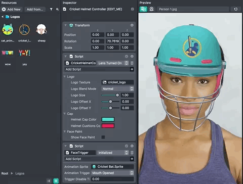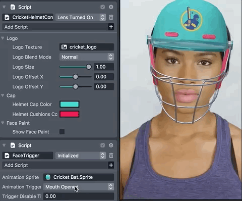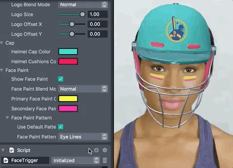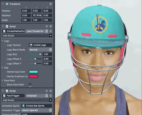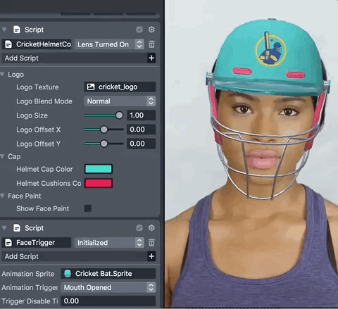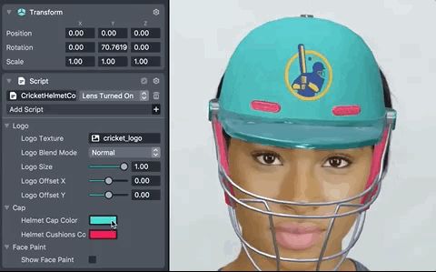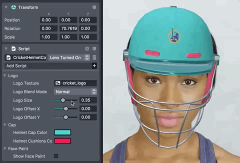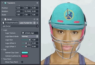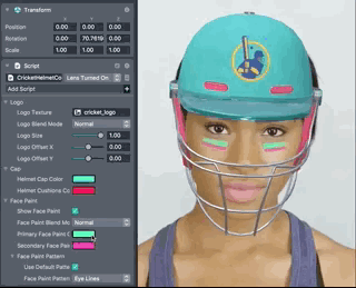 The Cricket Helmet Template lets users create a customizable cricket helmet. This template is a great starting point to easily feature your own 2D artwork in a Face Lens. It comes with a configurable 3D cricket helmet which you can recolor and decorate with any image you like.