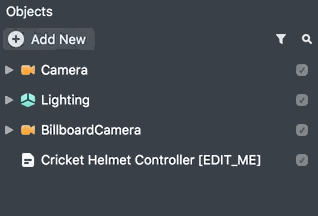 To customize the cricket helmet, select the Cricket Helmet Controller [EDIT_ME] object in the Objects panel and adjust its settings in the Inspector panel. The sections below walk through each of the customizable settings.