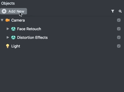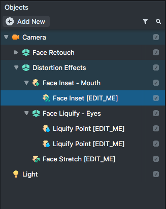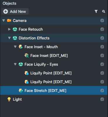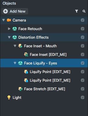 To add a new Face Liquify Effect, select + -> Face Effects -> Face Liquify in the Objects Panel.