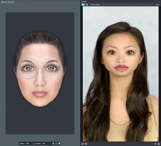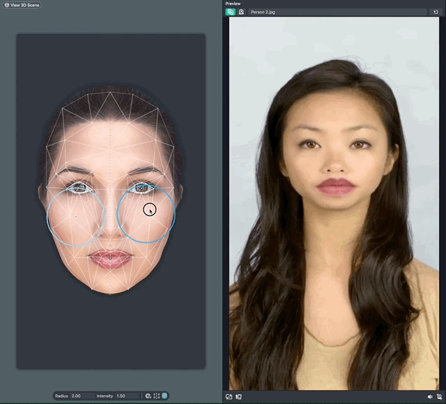 You can adjust the radius and intensity of the Face Liquify effect by setting the values under the 2D editor.
