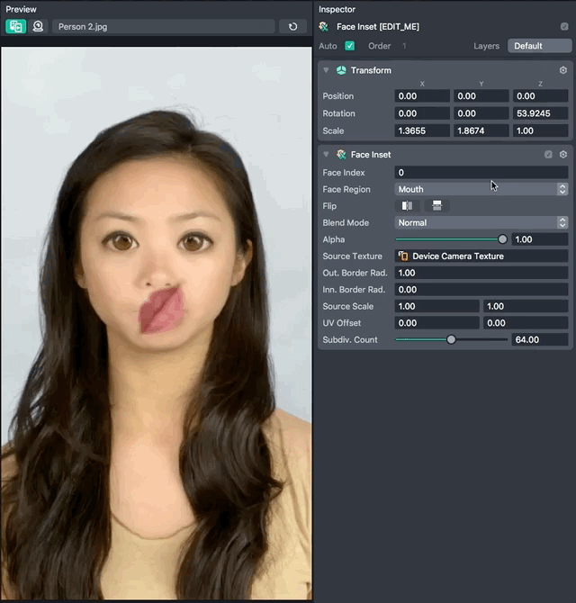 You can adjust the appearance (including feathering, blend mode, mirroring, and more) of the Face Inset Effect by adjusting the properties of the Face Inset Component in the Inspector panel. Here, you can also change the part of the face used in the effect.