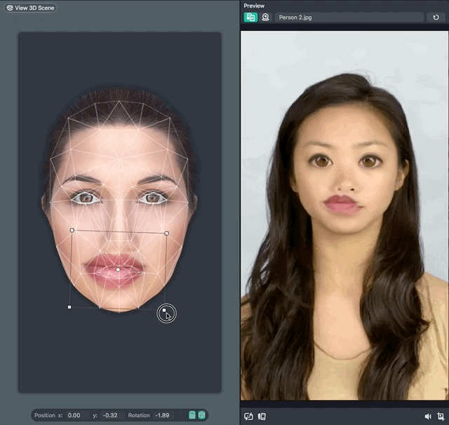 Select the Face Inset object to modify it. In the Scene panel, you can drag and resize the Mouth to any part of the face. Holding Alt while dragging the Face Inset will rotate the Face Inset.