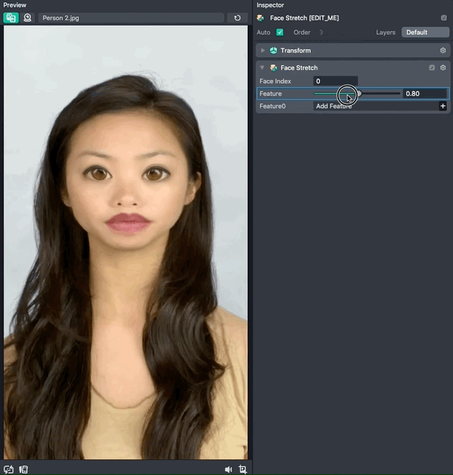 You can change the strength of the Face Stretch Effect by adjusting the Face Stretch Component’s Feature slider in the Inspector panel.