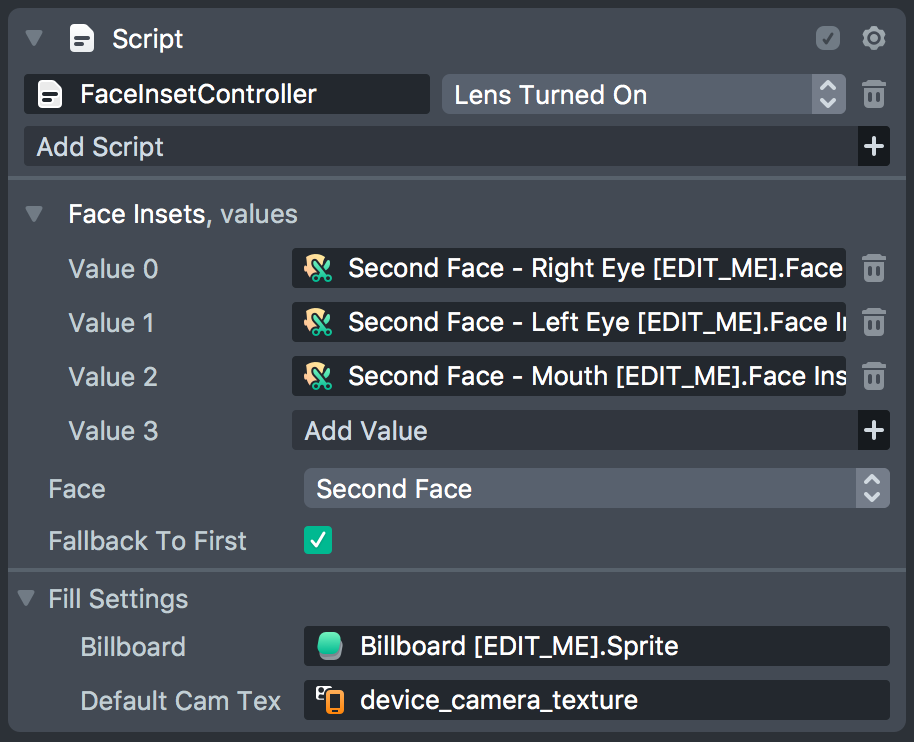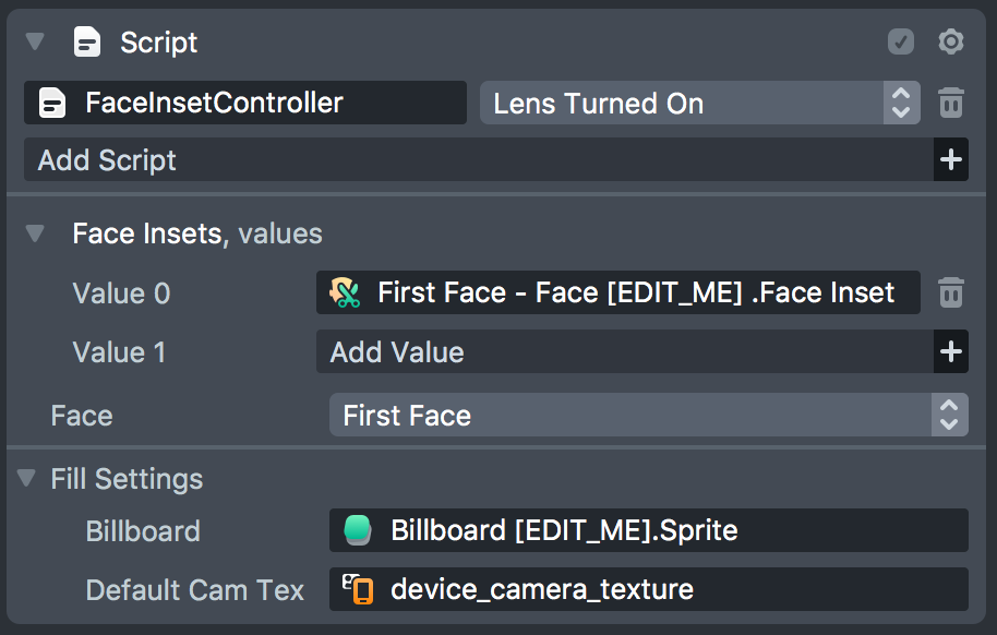 The template includes a script called FaceInsetController which allows you to easily manage multiple faces. The script takes in a list of Face Inset objects. Then, a simple dropdown allows you to assign the inputted objects to the first or second face. Additionally, this script intelligently maintains the positions of the face insets in relation to the Screen Image when the Lens is used on different device resolutions.