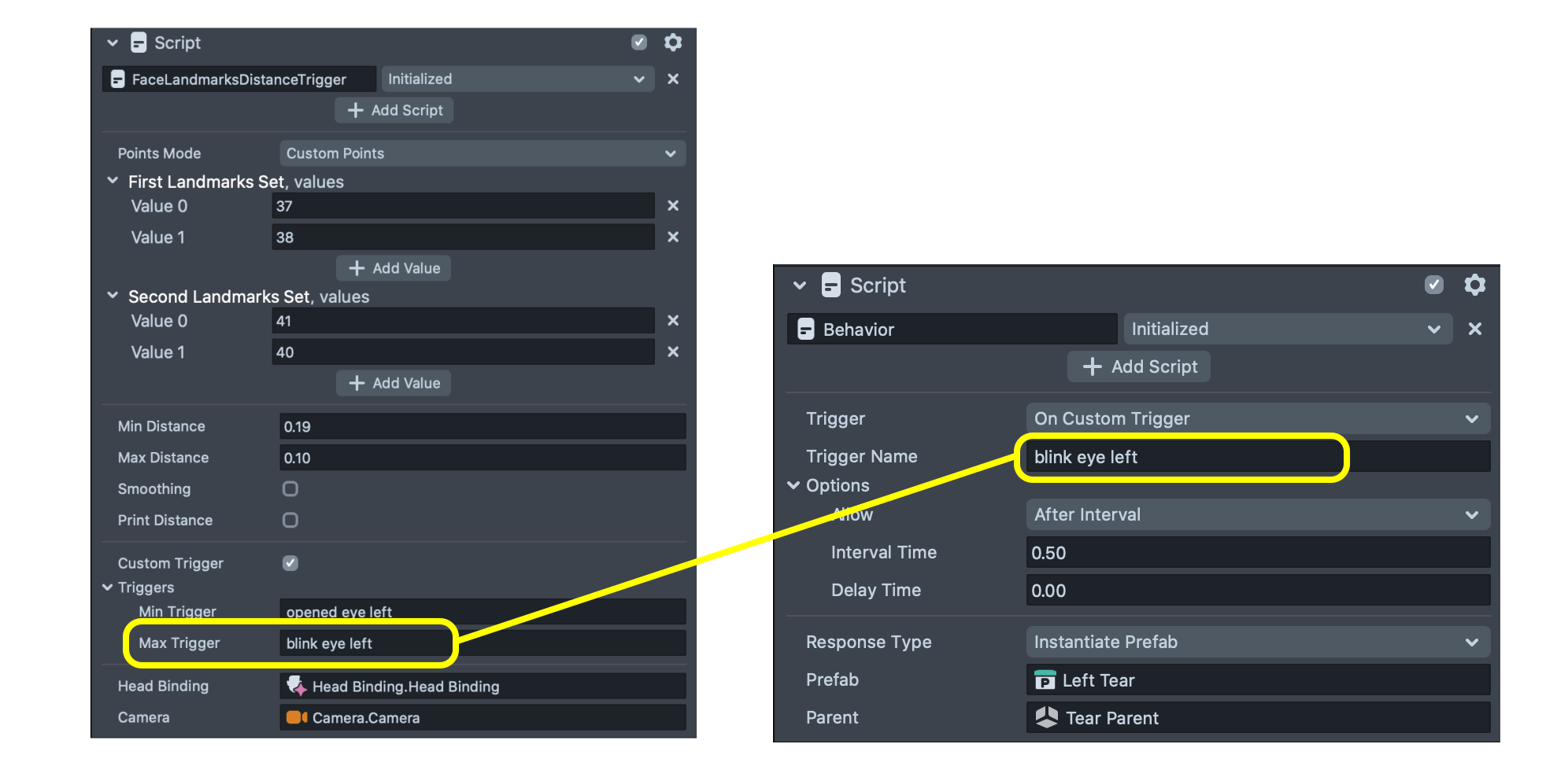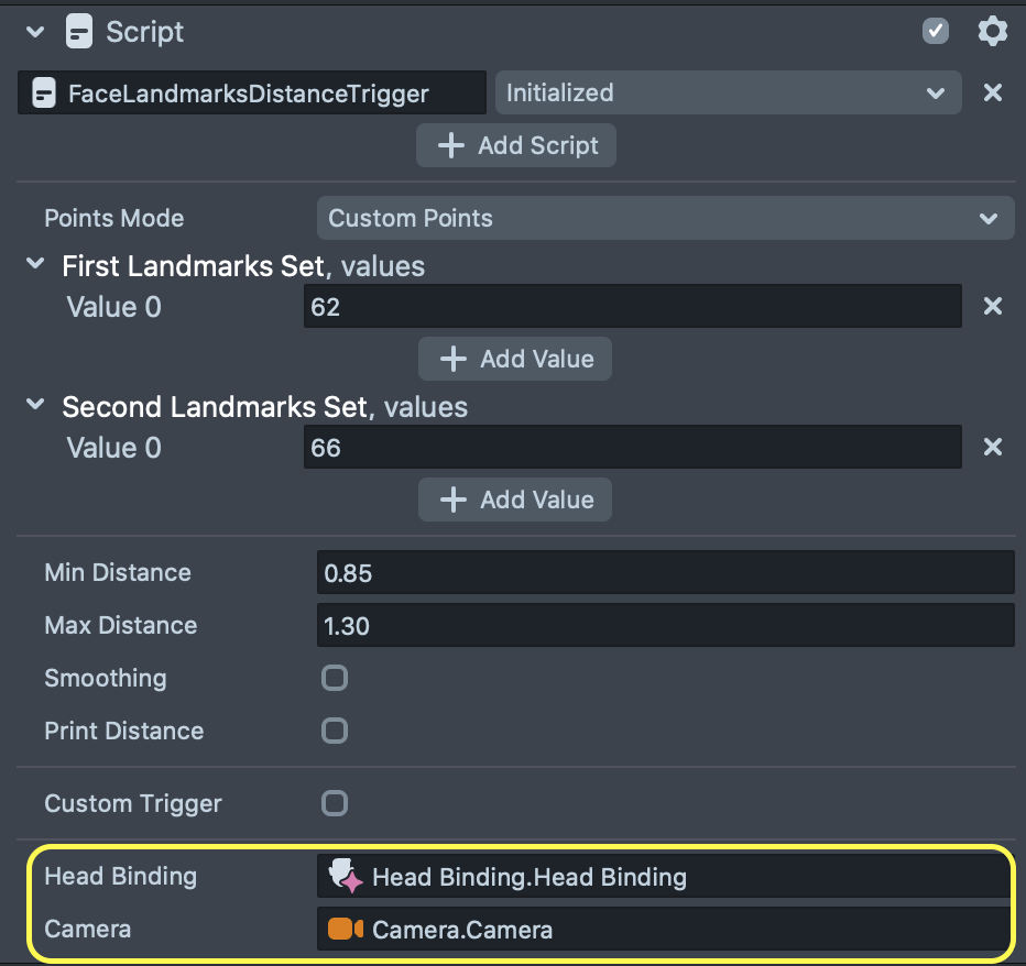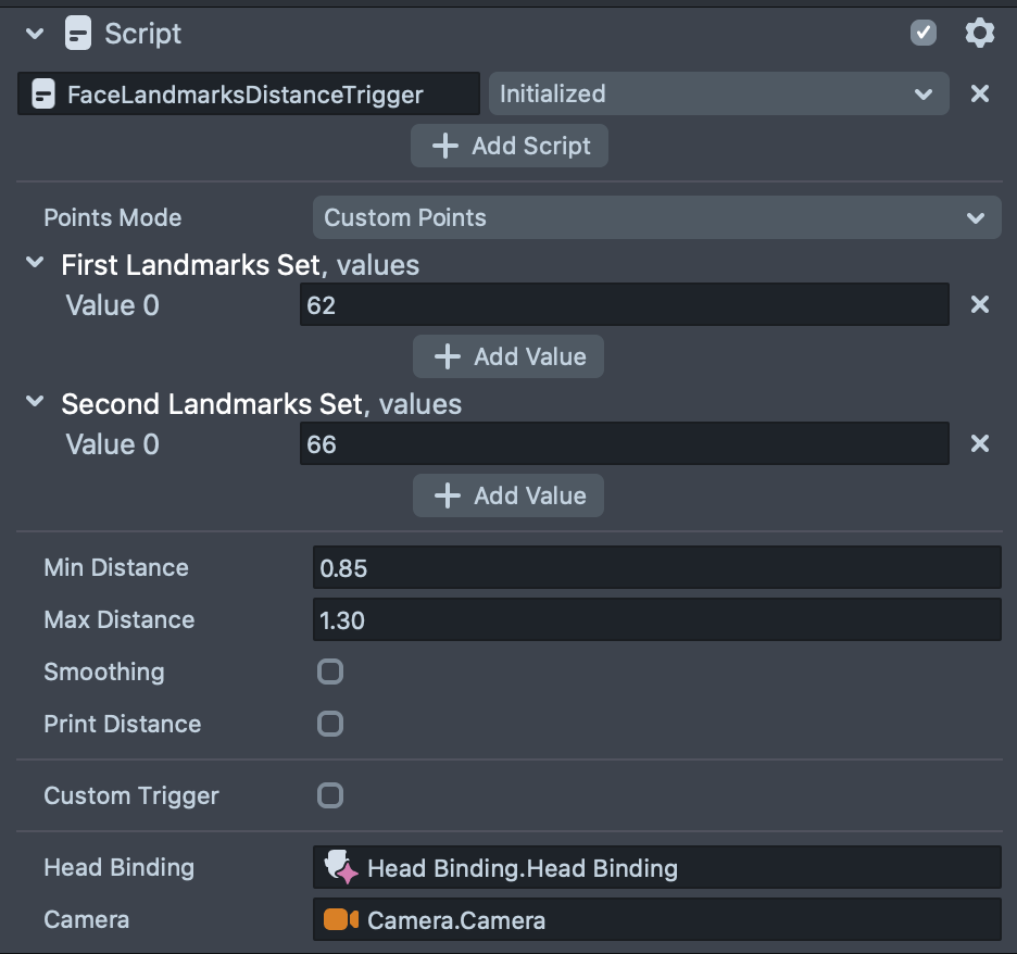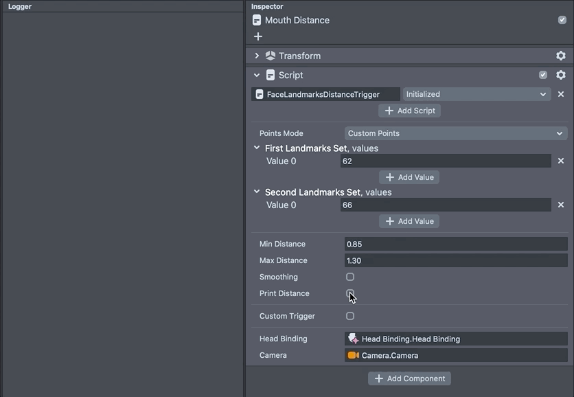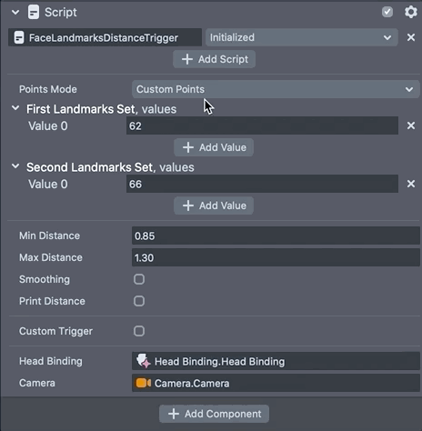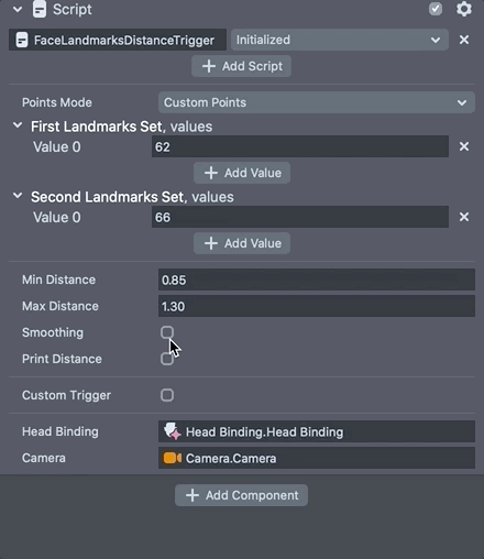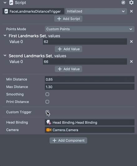 The sections below walk through each customizable setting in the FaceLandmarksDistanceTrigger script.
