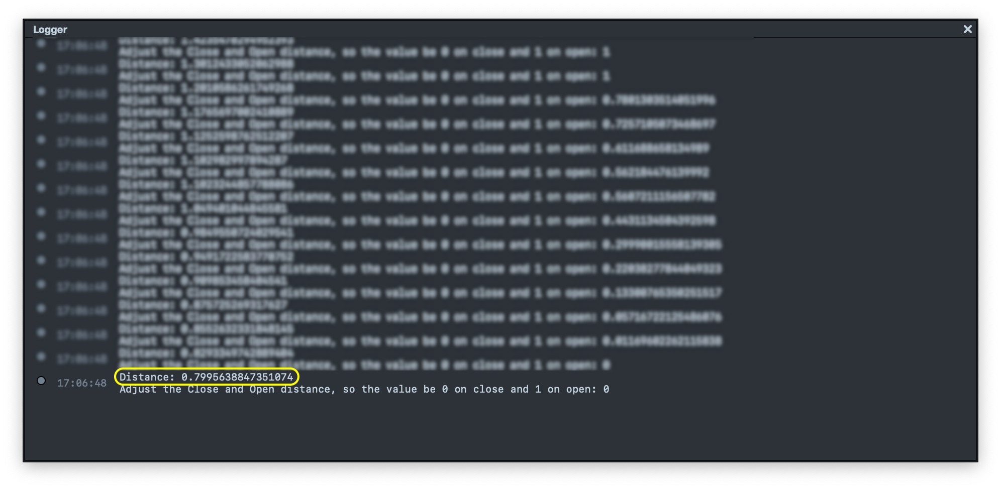 The same way works for Max distance as well. For example, to find the maximum distance between upper and lower lips, open your mouth and see the Distance value in the logger. That value is yourMax Distance value.