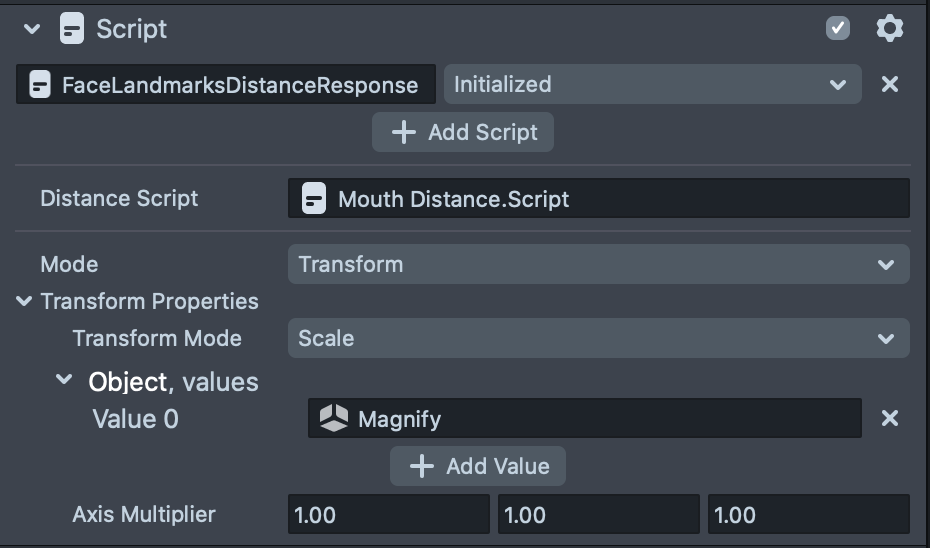 This mode allows you to move or scale your object based on the values that received from the FaceLandmarksDistanceTrigger.